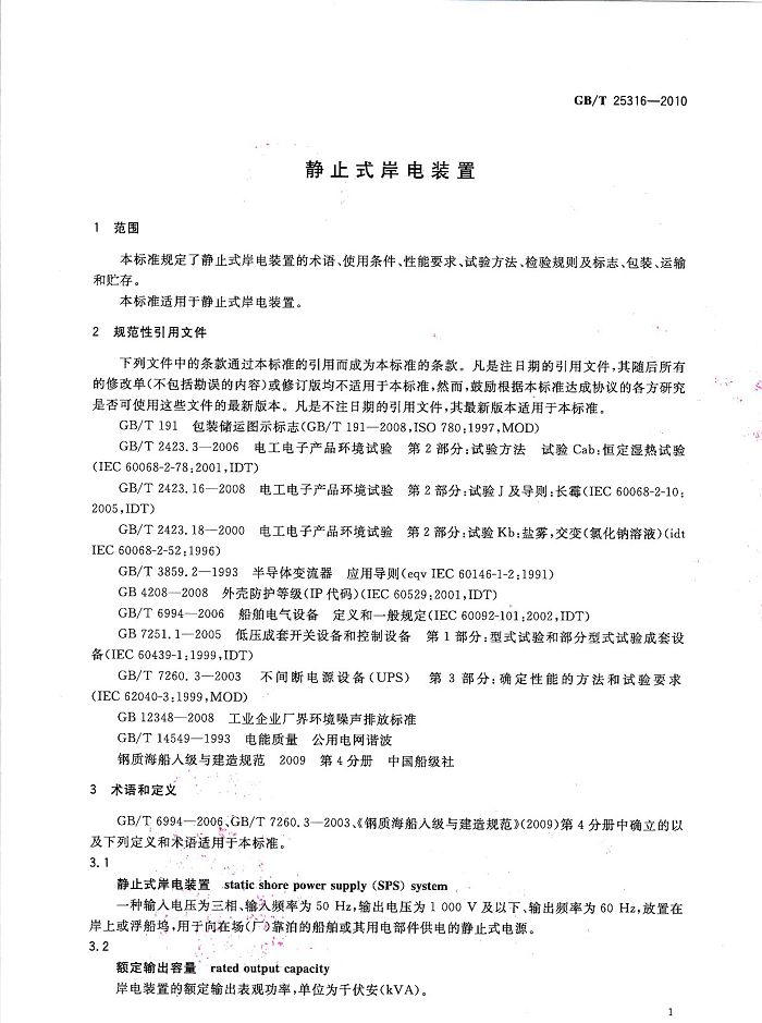 創(chuàng)統(tǒng)負(fù)責(zé)起草制訂GB/T25316《靜止式岸電裝置》